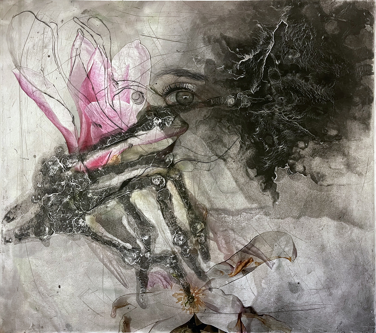 Iris Kumar’s areas of expertise are in traditional intaglio and relief printmaking; processes that explore integrating digital prints with traditional media; and combining printed imagery from both digital and traditional sources with painted imagery on canvas and carved wood. She is a member of Full Tilt Print Studio a professional print shop and has exhibited widely in the U.S. and internationally in Germany, the Republic of North Macedonia, and Japan.
